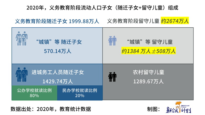 2020年,義務(wù)教育階段隨遷子女1999.88萬人,其中進城務(wù)工人員隨遷子女1429.74萬人,進城務(wù)工人員隨遷子女中,在公辦學(xué)校就讀的比例為80.0%。“城鎮(zhèn)”等隨遷子女(還包括少量遷入地是鄉(xiāng)村的隨遷子女)570.14萬人。