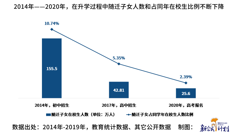2013年——2020年,普通高中隨遷子女招生人數(shù)從25.5萬人逐年增長到58.4萬人,初中畢業(yè)生中隨遷子女在居住地升入普通高中的比例也從2013年27.77%逐年增長到39.64%,依然大幅低于全國初中畢業(yè)生升入普通高中的比例,這還沒有不考慮到很多隨遷子女受政策限制,無法在流入地參加中考,只能提早“返鄉(xiāng)”繼續(xù)就讀,而無法在居住地作為隨遷子女畢業(yè)的情況。