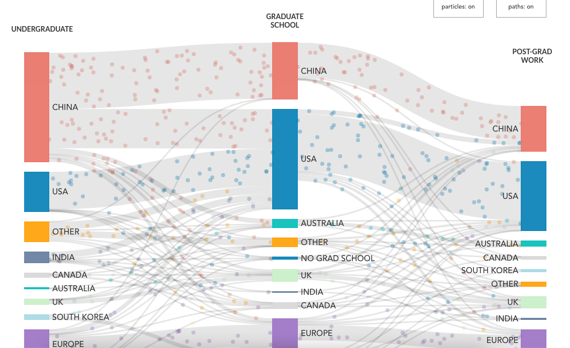 2. 除了美國和中國之外,英國和韓國以及歐洲作為頂級(jí)AI人才工作目的地的競(jìng)爭(zhēng)力略有提高。就AI人才來源(基于本科學(xué)歷判斷)而言,印度和加拿大的比例相對(duì)下降。