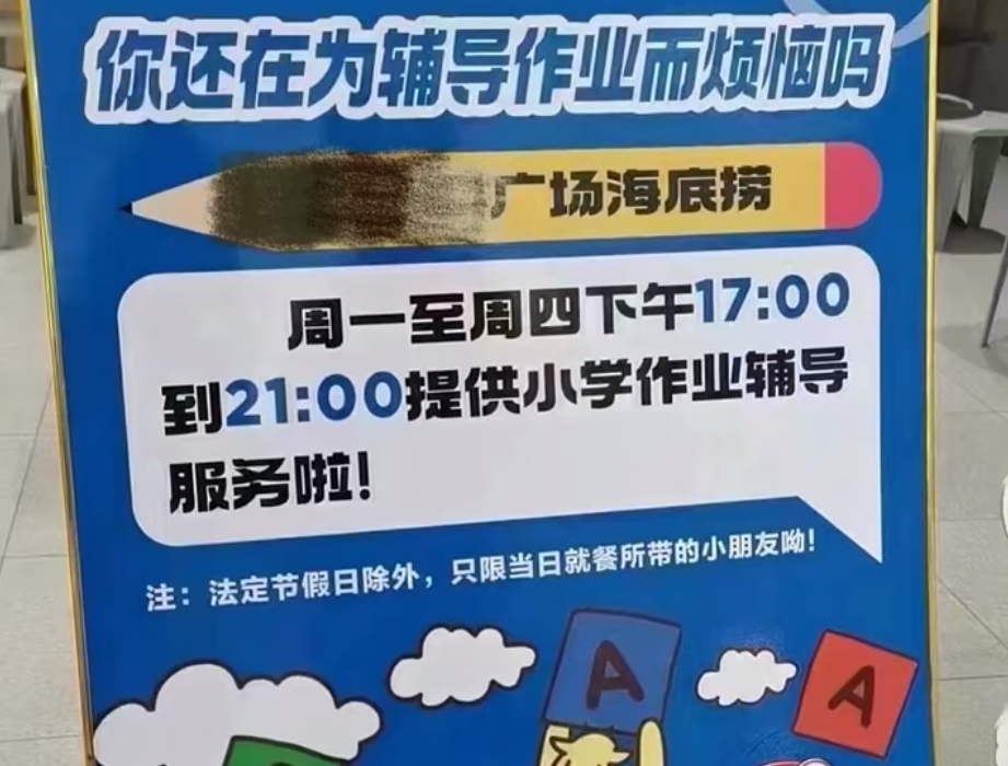 此外,海底撈相關(guān)負責(zé)人也回應(yīng)稱,是發(fā)海報的門店為用餐過程中有學(xué)習(xí)需求的孩子提供的學(xué)習(xí)空間,是在服務(wù)業(yè)范圍內(nèi)提供力所能及的幫助,并不涉及專業(yè)輔導(dǎo)和培訓(xùn)。