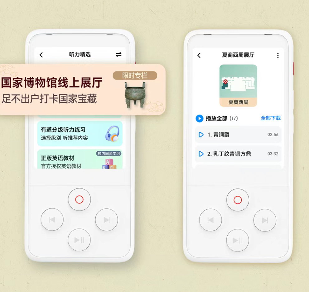 多知網(wǎng)5月21日消息,據(jù)“有道學(xué)習(xí)硬件”,有道聽(tīng)力寶近日上線國(guó)博文物講解內(nèi)容,涉及國(guó)家博物館的8個(gè)展廳、105個(gè)藏品。