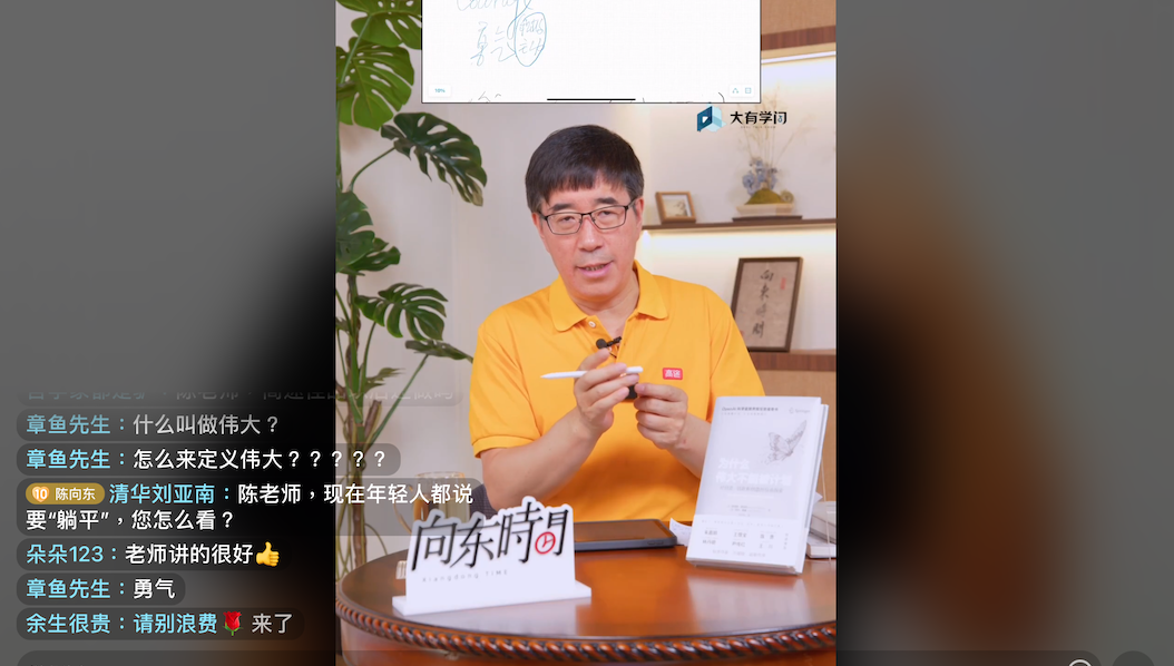 一個(gè)有意思的細(xì)節(jié)是,陳向東9月21日這天的第一場(chǎng)直播持續(xù)一個(gè)半小時(shí),核心是介紹《為什么偉大不能被計(jì)劃》這本書(shū)并拆解論證“偉大不能被計(jì)劃”這一觀點(diǎn)。