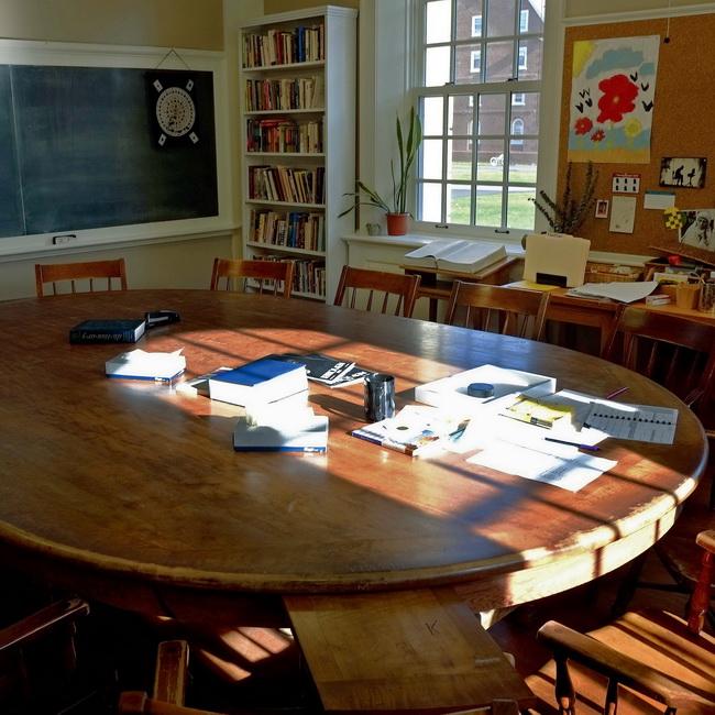 走在??巳匦@,透過(guò)教室窄窄的玻璃窗,可以看到一張張醒目的橢圓形木桌,學(xué)生稱之為“哈克尼斯圓桌”。在整個(gè)學(xué)校,這樣的桌子大約有上百?gòu)?。離開學(xué)校不遠(yuǎn)的地方,還有全世界唯一一家定制“哈克尼斯圓桌”的公司。