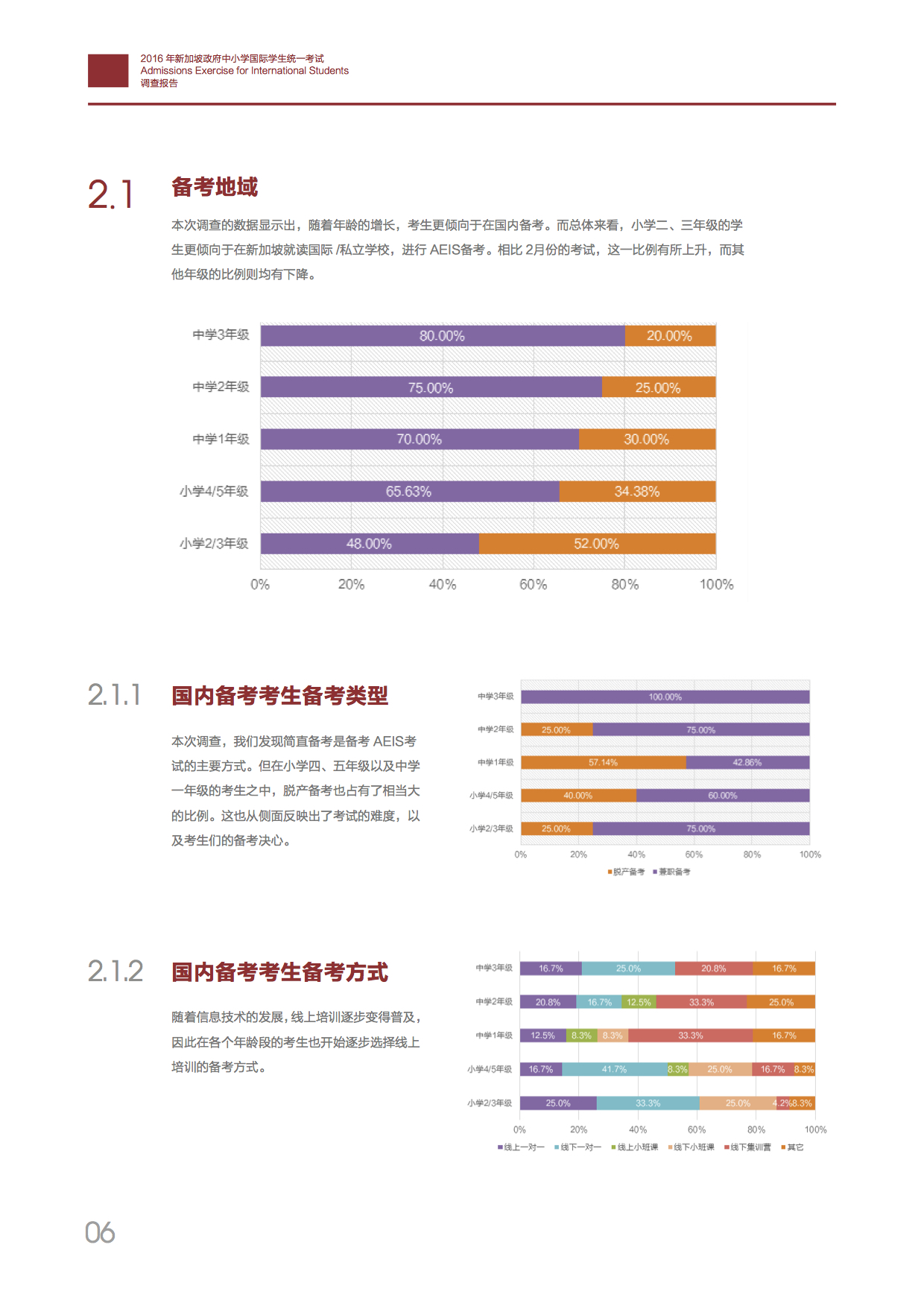 ?編者按:近日,AEIS考試網(wǎng)聯(lián)合新加坡教育網(wǎng)、新加坡教育與考試服務(wù)中心、新加坡中國(guó)學(xué)生服務(wù)中心,針對(duì)2016年9月新加坡政府中小學(xué)國(guó)際學(xué)生統(tǒng)一考試的做出了一項(xiàng)調(diào)查。報(bào)告中表示,考生開始更多的選擇線上培訓(xùn)的方式;考生備考時(shí)間縮短,主要集中在3-6月;在國(guó)內(nèi)參加培訓(xùn)的考生通過率明顯高于其他培訓(xùn)方式。低齡留學(xué)趨勢(shì)日益明顯,新加坡成為華人家長(zhǎng)優(yōu)先考慮的國(guó)家之一。