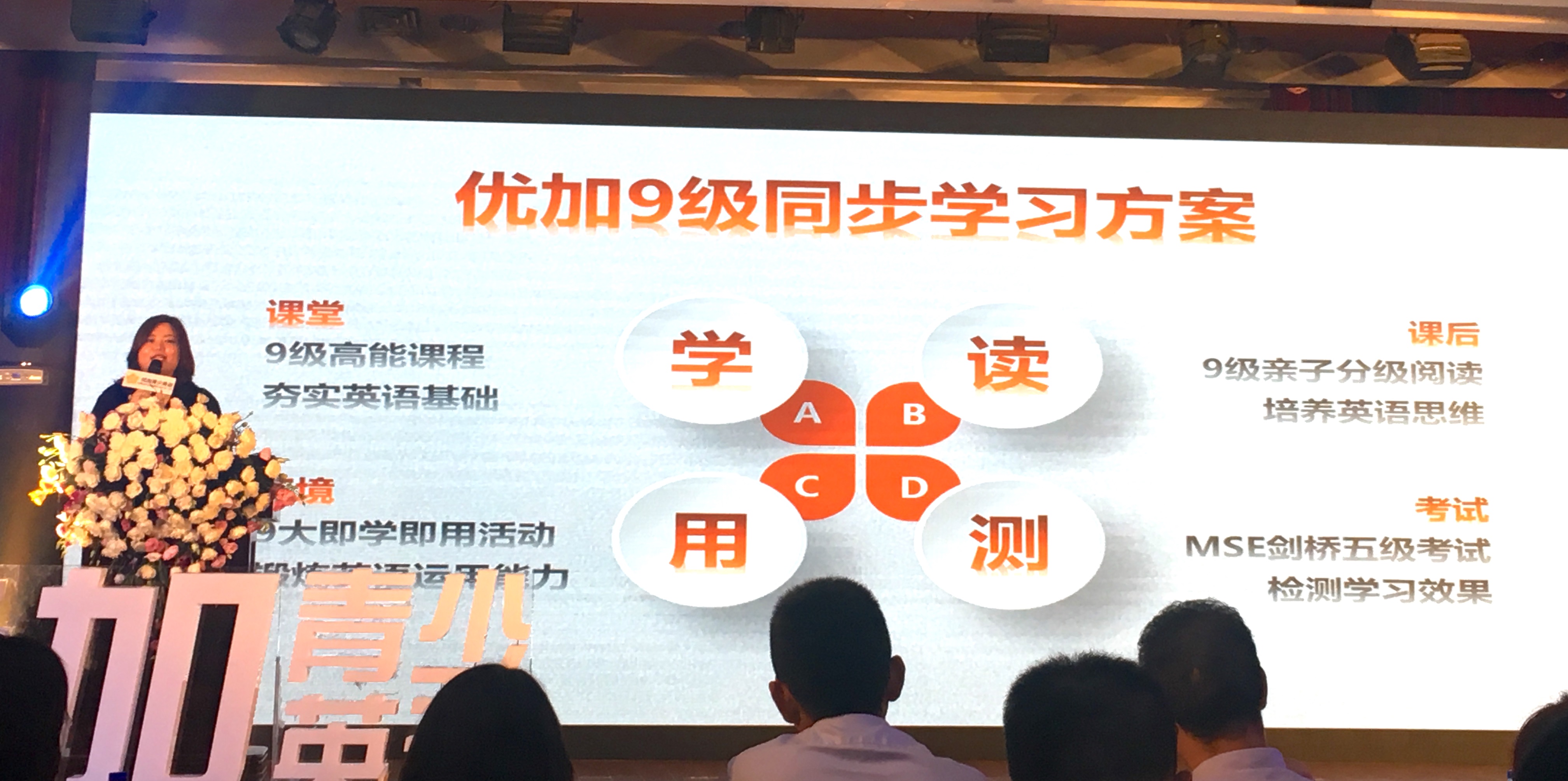 在課堂教學(xué)方面,推9級“高能課程”;在家庭教育方面,與麥克米倫合作推出9級親子分級閱讀;在學(xué)習(xí)環(huán)境方面,推9大即學(xué)即用活動,包括唱響英文、英語朗誦、動畫配音、英語話劇等;在測評方面,引進MSE劍橋英語通用五級考試。