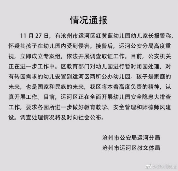 滄州市運河區(qū)區(qū)教育部門對幼兒園進行暫時閉園處理,對有轉(zhuǎn)園需求的幼兒安置到運河區(qū)兩所公辦幼兒園。