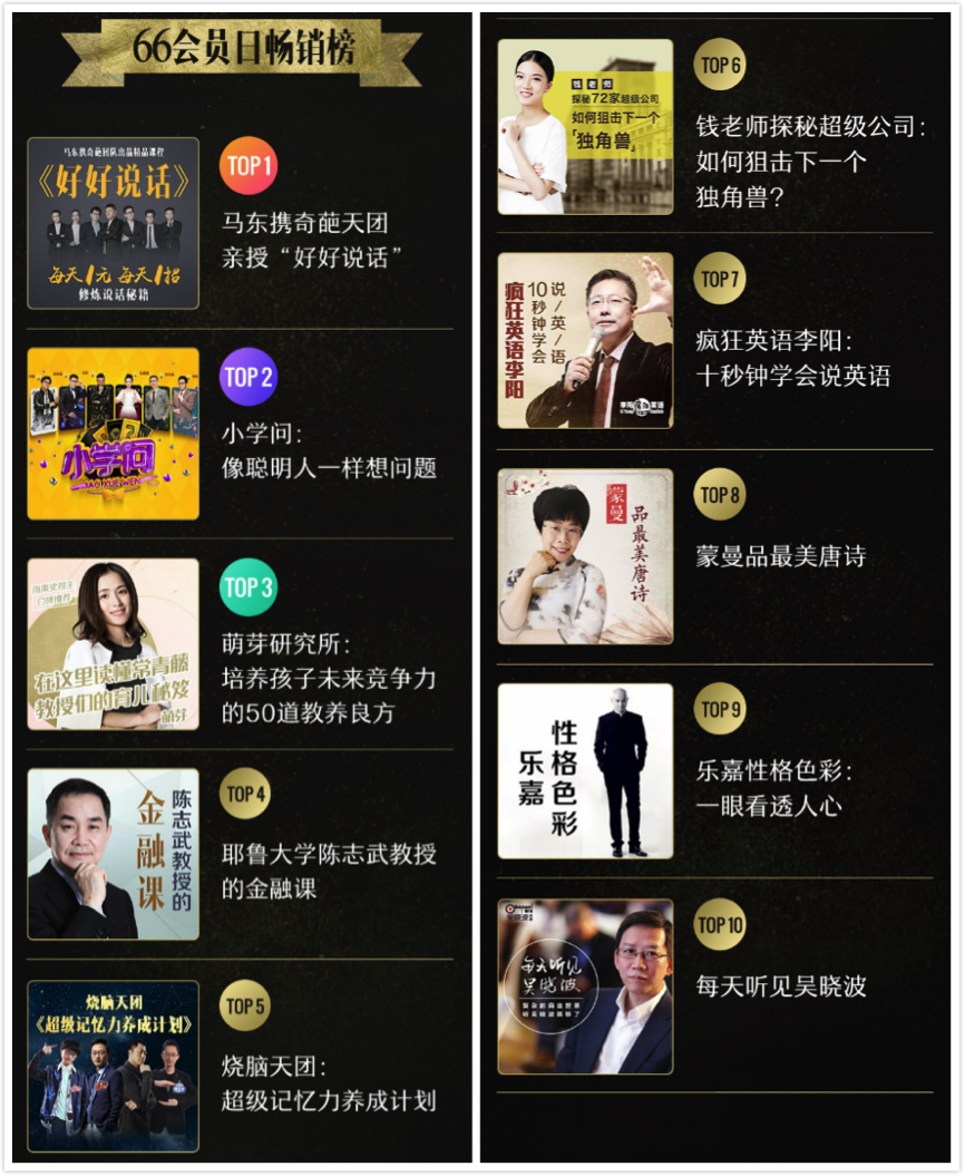 截至6月6日20點(diǎn),喜馬拉雅已發(fā)展會(huì)員約221萬人,在知識(shí)內(nèi)容方面,馬東領(lǐng)銜“奇葩天團(tuán)”推出的的成長類課程《好好說話》與《小學(xué)問》非別位于暢銷榜前兩名: