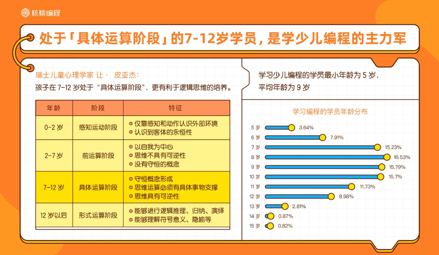 當(dāng)然,與其他素質(zhì)教育相比,少兒編程教育具備一定的特殊性,需要保障學(xué)習(xí)成果的同時兼顧青少年的學(xué)習(xí)興趣。對于青少年,培養(yǎng)編程思維也擁有一個“黃金年齡段“。根據(jù)報告,7-12歲的青少年群體是學(xué)習(xí)少兒編程的主力軍。瑞士兒童心理學(xué)家讓·皮亞杰曾表示,孩子在7-12歲處于具體運(yùn)算階段,更有利于邏輯思維的培養(yǎng)。根據(jù)報告調(diào)研,學(xué)習(xí)少兒編程的學(xué)員最小年齡為5歲,平均年齡為9歲。