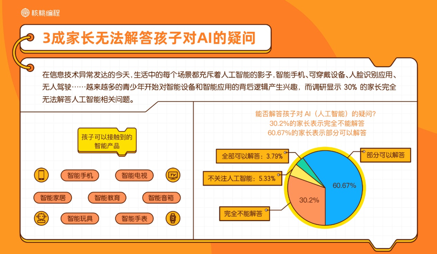 但是讓人印象深刻的是,30.2%的家長完全無法解答人工智能相關(guān)問題,60.67%的家長可以部分解答,僅有3.79%的家長可以完全解答孩子對人工智能的疑問。