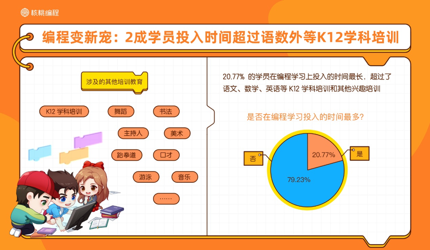 據(jù)悉,報告基于超過65萬同期在讀學(xué)員大數(shù)據(jù)以及4.5萬份調(diào)研數(shù)據(jù),歷時近兩個月深度調(diào)研與分析制作而成。報告顯示7-12歲的青少年群體是學(xué)習(xí)少兒編程的主力軍,20.77%的孩子在編程上投入的時間超過語文、數(shù)學(xué)、英語等K12學(xué)科培訓(xùn)以及其他興趣培訓(xùn)。