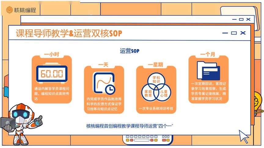 核桃編程課導(dǎo)教學(xué)部負(fù)責(zé)人曾鵬表示:“我們教學(xué)服務(wù)的宗旨就是讓家長(zhǎng)選擇核桃編程更加放心。為了更好的服務(wù)學(xué)員與傳授編程知識(shí),我們提出了“四個(gè)一”行動(dòng),即一小時(shí)高效解答問題、一天內(nèi)完成學(xué)員作品批改、一星期一次專業(yè)系統(tǒng)培訓(xùn)考核以及一個(gè)月一次定期回訪?;贏I系統(tǒng)客觀記錄學(xué)員的學(xué)習(xí)效果,我們課導(dǎo)老師精準(zhǔn)掌握每一位孩子的學(xué)習(xí)狀況,真正做到個(gè)性化、專業(yè)化的教學(xué)服務(wù),同時(shí)實(shí)現(xiàn)每一位家長(zhǎng)都收到學(xué)員的專屬學(xué)情檔案”。