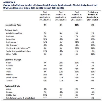 而這個(gè)數(shù)據(jù)在Graduate (研究生)部分也體現(xiàn)得非常明顯。我們看一組Council of Graduate Schools 去年11月發(fā)布的International Phase III 2014 Report 的一組數(shù)據(jù):