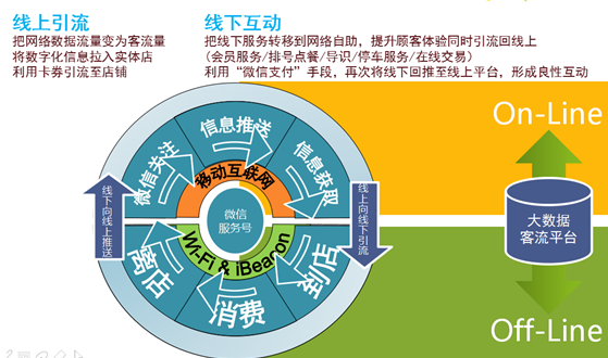 在上述服務(wù)中,完成了線下向線上推送、線上向線下引流的循環(huán):微信關(guān)注--信息推送--用戶信息獲取(這些在線上完成)--到店--消費(fèi)--離店(這些在線下完成)。在這個(gè)過(guò)程中,微信支付起到串聯(lián)的作用。