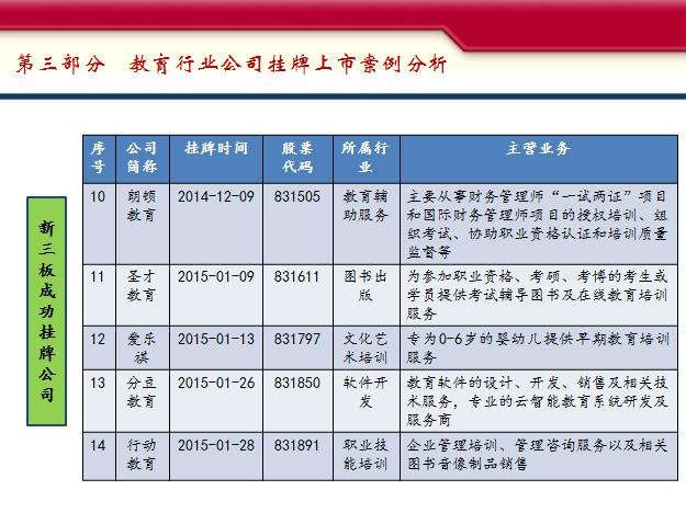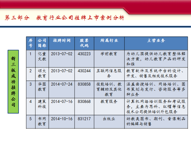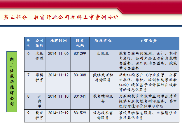第三部分是目前登錄新三板的一些教育類的公司,這塊我就不多說了,看一下有哪些公司,重點(diǎn)有哪些業(yè)務(wù),大家可以參照一下。