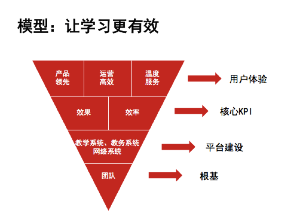 這是學(xué)而思的基因圖譜,核心是團(tuán)隊(duì),我們有三個系統(tǒng),我們這五年基本上是圍繞著教育過程和教育結(jié)果來服務(wù)的。我們希望學(xué)習(xí)的過程當(dāng)中,單位時間的學(xué)習(xí)效果能夠更高效。在起點(diǎn)和終點(diǎn)無法改變的時候,如果能夠改變一些過程,或許能夠給到教育這個行業(yè)帶來一些幫助和推力。效率指的是內(nèi)部團(tuán)隊(duì)的管理效率,不單指學(xué)生的學(xué)習(xí)效率,我們希望團(tuán)隊(duì)在運(yùn)營效率上通過互聯(lián)網(wǎng)的平臺工具,提升我們效率。我們希望最后呈現(xiàn)在客戶的面前的,是一個產(chǎn)品領(lǐng)先,高效運(yùn)營,并且有溫度的一個機(jī)構(gòu),這是我們的用戶體驗(yàn)的層面。