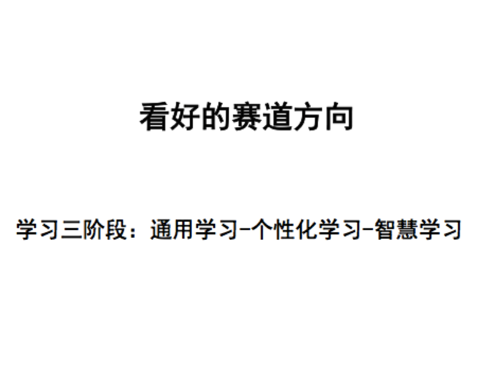學(xué)習(xí)的三階段,我們認(rèn)為原來的學(xué)習(xí)在工業(yè)的背景情況下是通用的學(xué)習(xí),后來出現(xiàn)了學(xué)大、京翰,現(xiàn)在出現(xiàn)了輕輕,他們希望能夠解決學(xué)習(xí)的個性化問題。毫無疑問,如果你將來想成為不同的人,你確實(shí)不應(yīng)該從小學(xué)到初中到高中,前面12年到16年學(xué)的都是同樣的東西,最后一年開始進(jìn)行專業(yè)化的分科,其實(shí)那個時候你已經(jīng)油鹽不進(jìn)了。我們講由學(xué)習(xí)目標(biāo)的導(dǎo)向去推學(xué)習(xí)的路徑應(yīng)該有不同的練功渠道。個性化的學(xué)習(xí)是有機(jī)會的,而且現(xiàn)在的模式也存在很多的問題和缺陷,能不能解決這個缺陷我們拭目以待,對于小班教學(xué)和大班教學(xué),智慧學(xué)習(xí)是我們希望未來能夠看到的方向,機(jī)器輔助于人解決一部分的學(xué)習(xí)問題,讓人的因素發(fā)揮更有價值。我們看好這個跑道的未來發(fā)展方向。