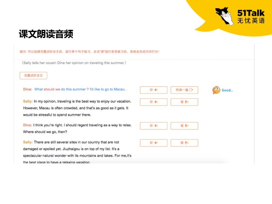 51Talk的課文朗讀音頻,在學(xué)生跟讀之后會有評分,這也是我們的優(yōu)勢所在。