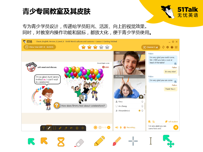 青少教育非常難的點在于讓孩子的注意力隨著你走。51Talk作為在線機構(gòu),我們在細(xì)節(jié)上下功夫來保證孩子的注意力。